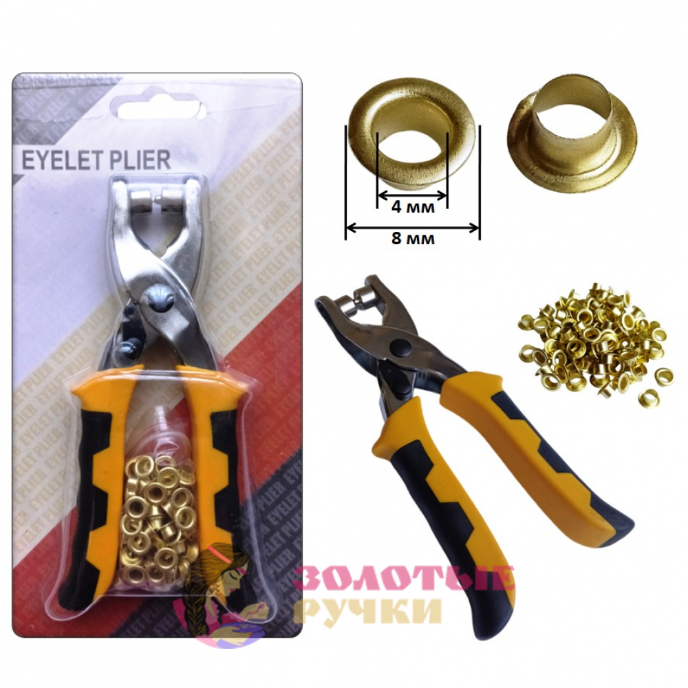 В набор входит: щипцы для установки люверсов и 100 металлических люверсов.