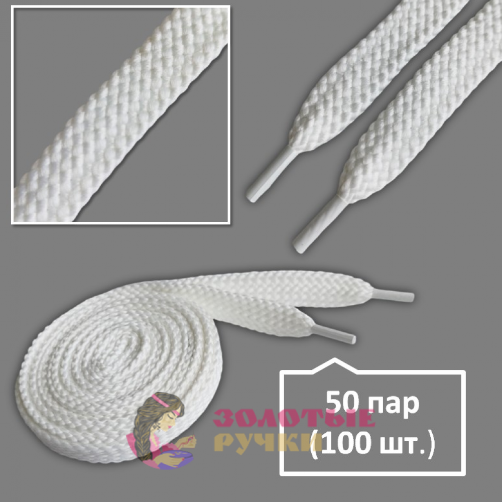 Шнурки кроссовочные. Длина: 100 см. Ширина: 10 мм. Цвет: белый. Количество в упаковке: 50 пар (100 шт.)