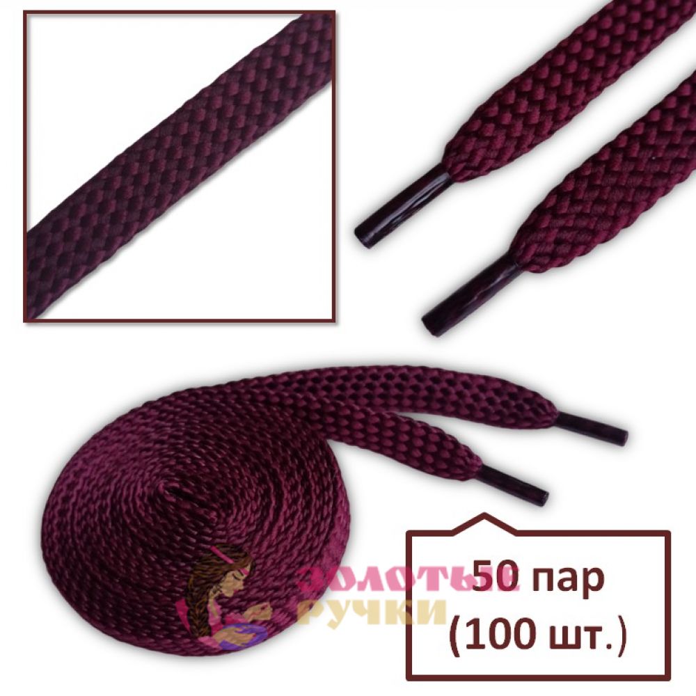 Шнурки кроссовочные. Длина: 100 см. Ширина: 10 мм. Цвет: бордовый. Количество в упаковке: 50 пар (100 шт.)