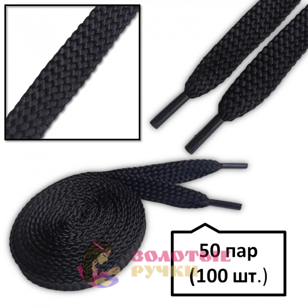 Шнурки кроссовочные. Длина: 100 см. Ширина: 10 мм. Цвет: черный. Количество в упаковке: 50 пар (100 шт.)