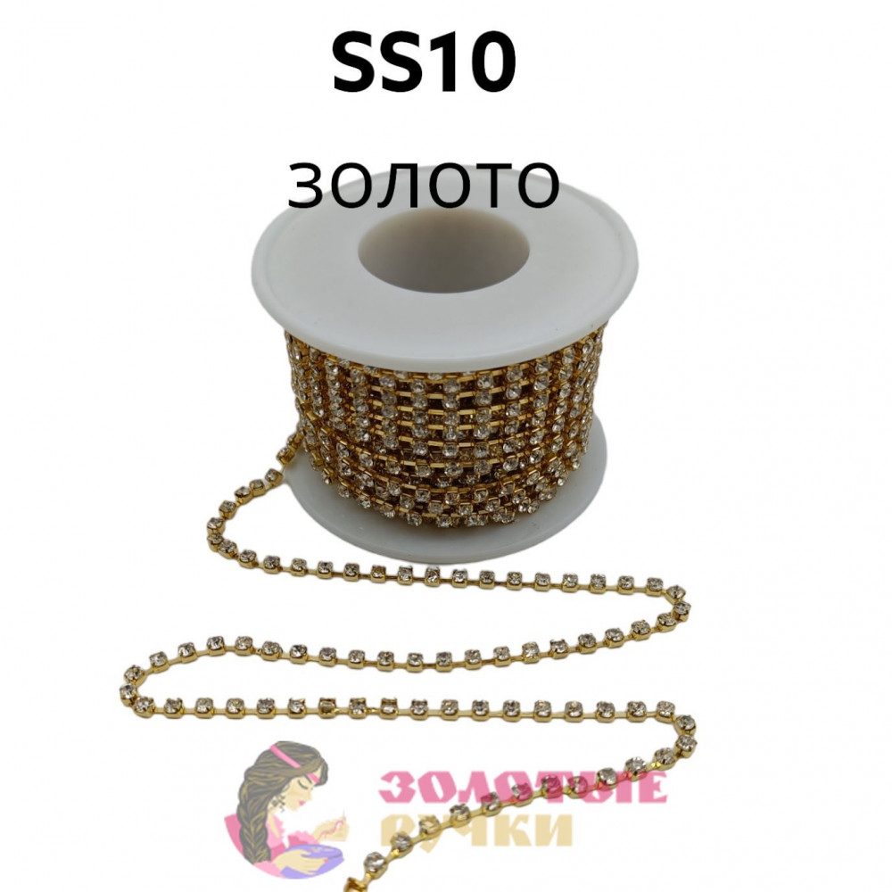 Стразы на бобине в золотой оправе на металлической основе (в бобине 9,14 м ), размер SS10 цвет белый