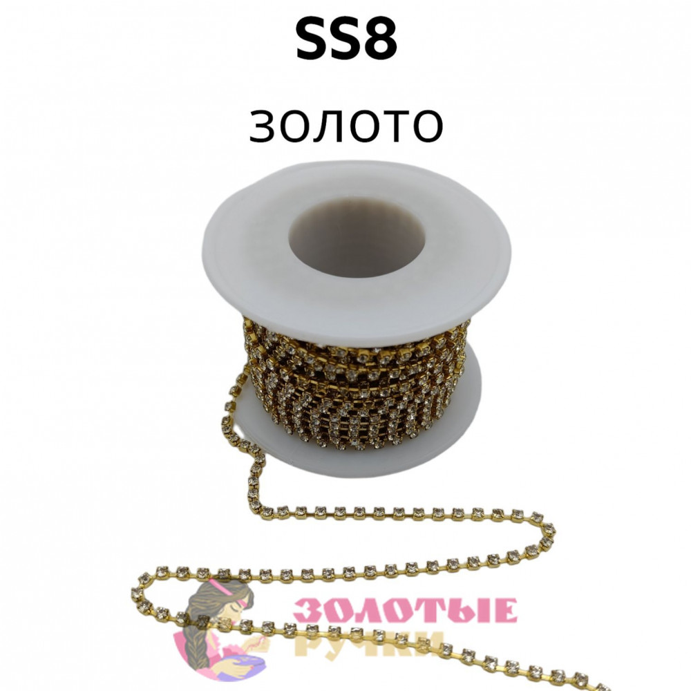 Стразы на бобине в золотой оправе на металлической основе (в бобине 9,14 м ), размер SS8AB цвет белый
