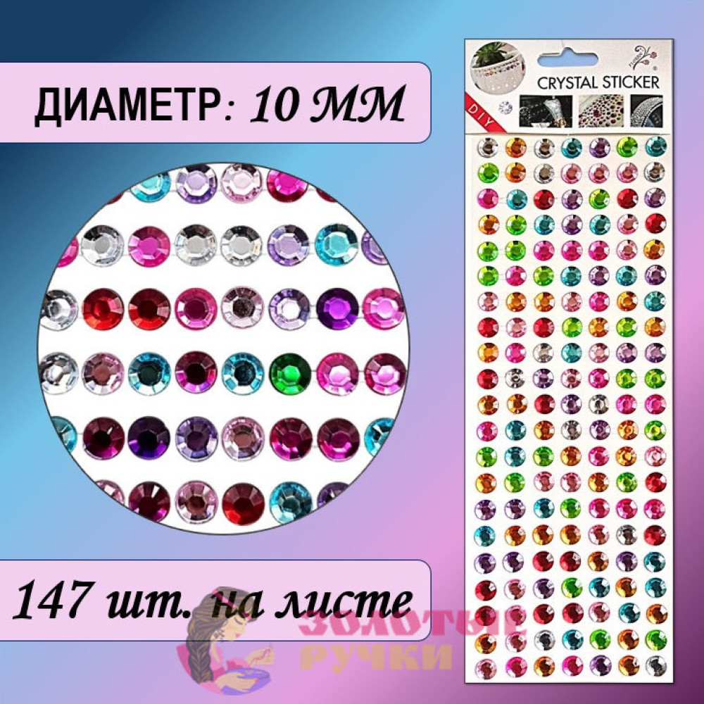 Стразы самоклеющиеся. Диаметр: 10 мм. Цвет: ассорти