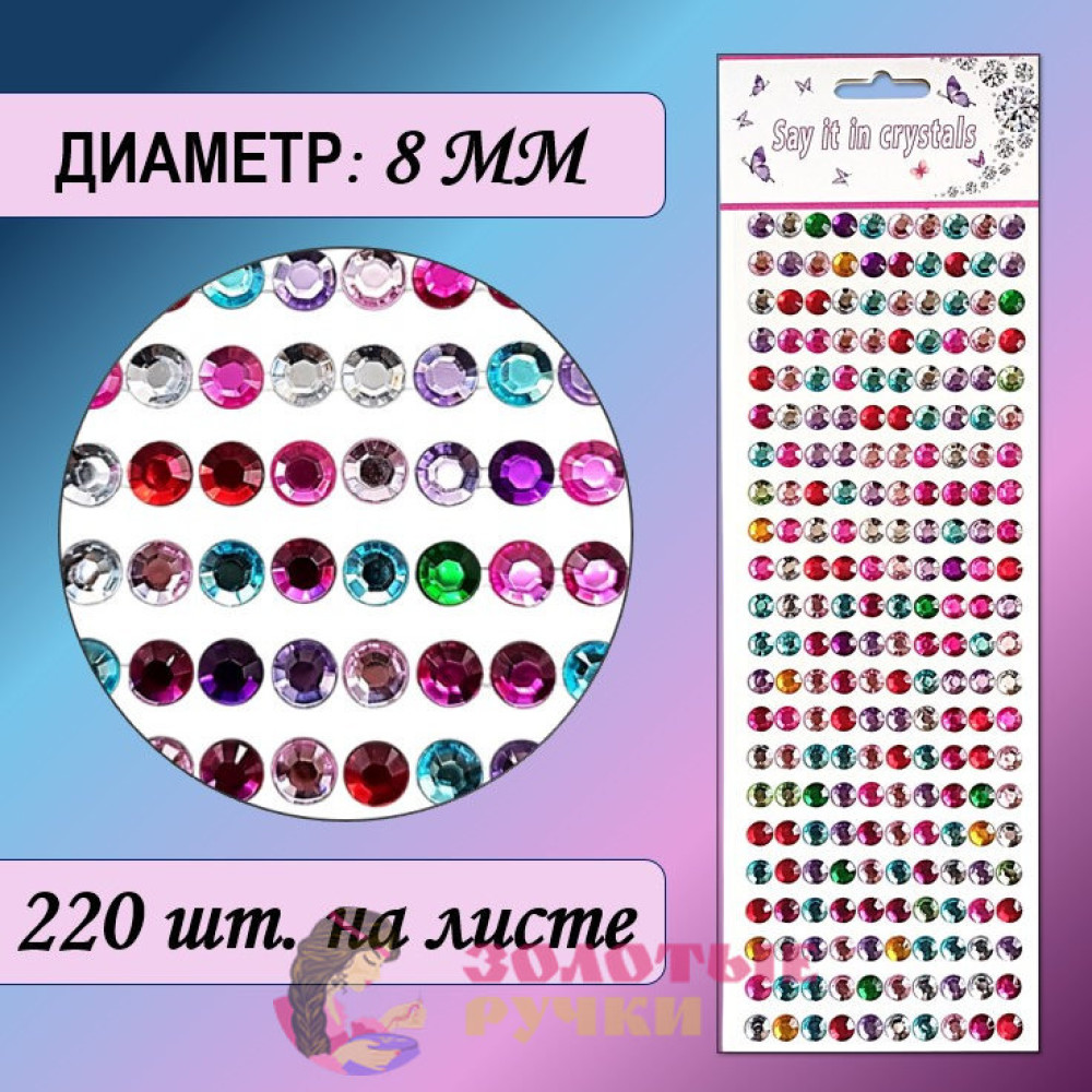 Стразы самоклеющиеся. Диаметр: 8 мм. Цвет: ассорти