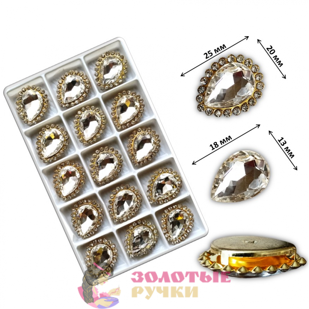 Стразы в металлических цапах пришивные "КАПЛЯ". Цвет: прозрачный в золоте. Количество в упаковке: 15 шт.