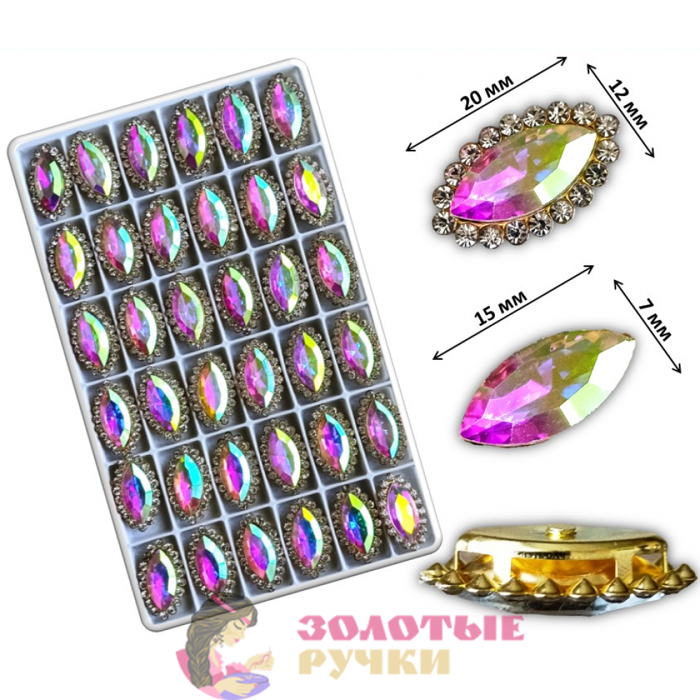 Стразы в металлических цапах пришивные "ЛОДОЧКА". Цвет: хамелеон в золоте. Количество в упаковке: 36 шт.