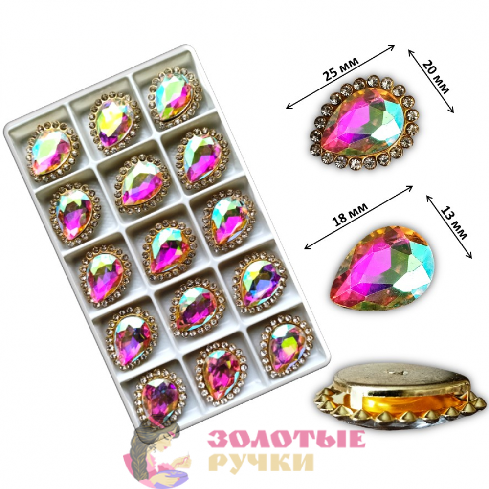 Стразы в металлических цапах пришивные "КАПЛЯ". Цвет: хамелеон в золоте. Количество в упаковке: 15 шт.