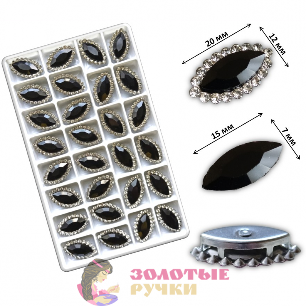 Стразы в металлических цапах пришивные "ЛОДОЧКА". Цвет: черный. Количество в упаковке: 28 шт.