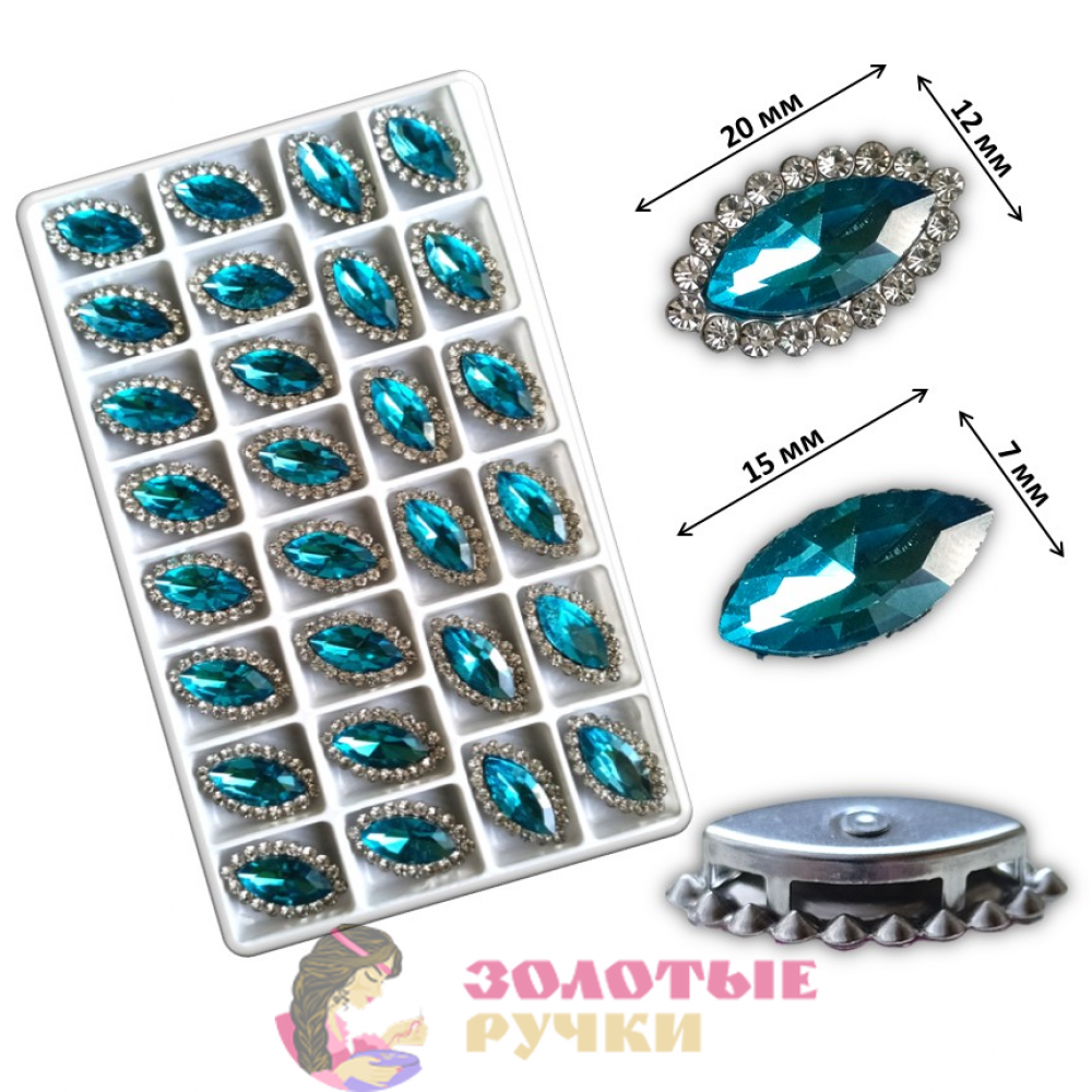 Стразы в металлических цапах пришивные "ЛОДОЧКА". Цвет: голубой. Количество в упаковке: 28 шт.