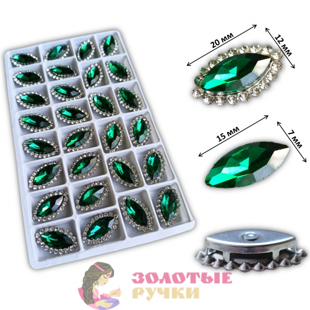 Стразы в металлических цапах пришивные "ЛОДОЧКА". Цвет: зеленый. Количество в упаковке: 28 шт.