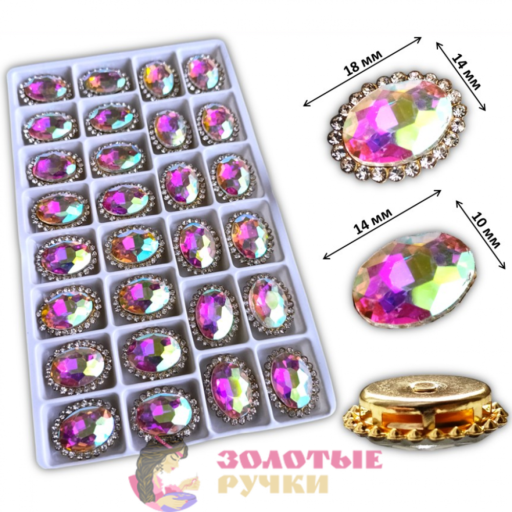 Стразы в металлических цапах пришивные "ОВАЛ". Цвет: хамелеон в золоте. Количество в упаковке: 28 шт.
