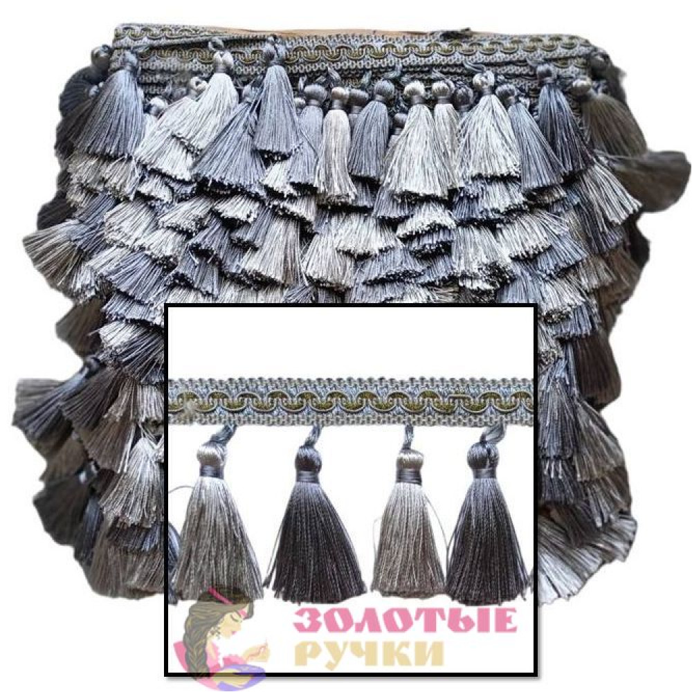 Тесьма декоративная с кисточками. Ширина: 8,5 см. Количество в упаковке: 11,88 м. Цвет: серый комбинированный.