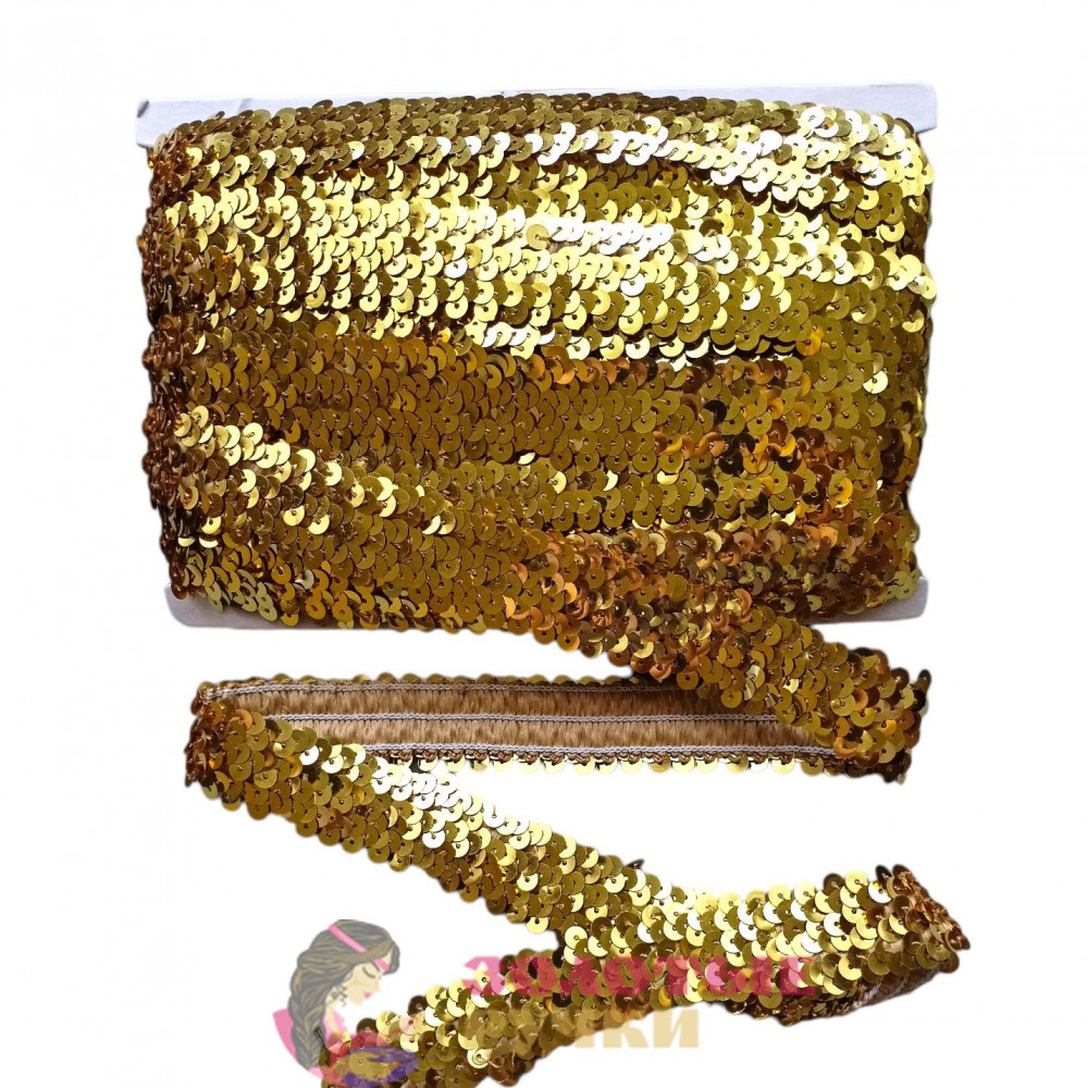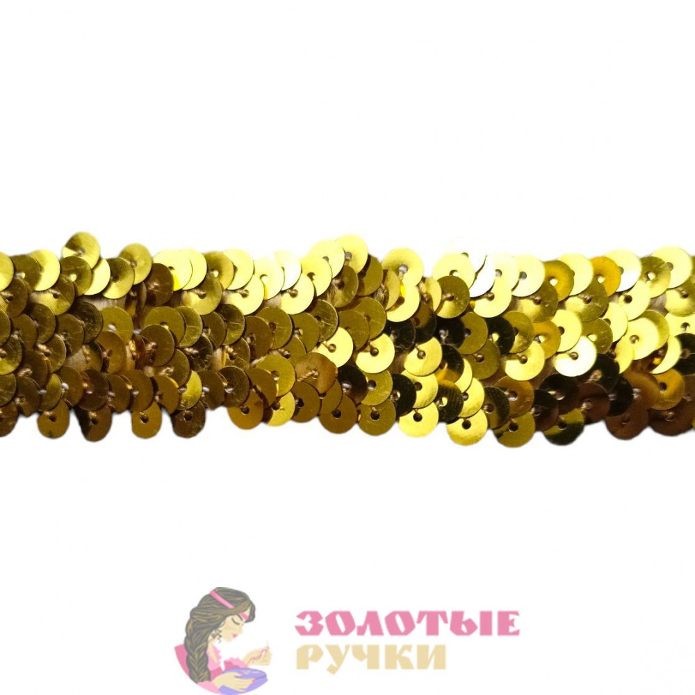 Тесьма декоративная с пайетками на резинке Ширина: 2 см. Количество в упаковке: 13,7 м. Цвет: золото.