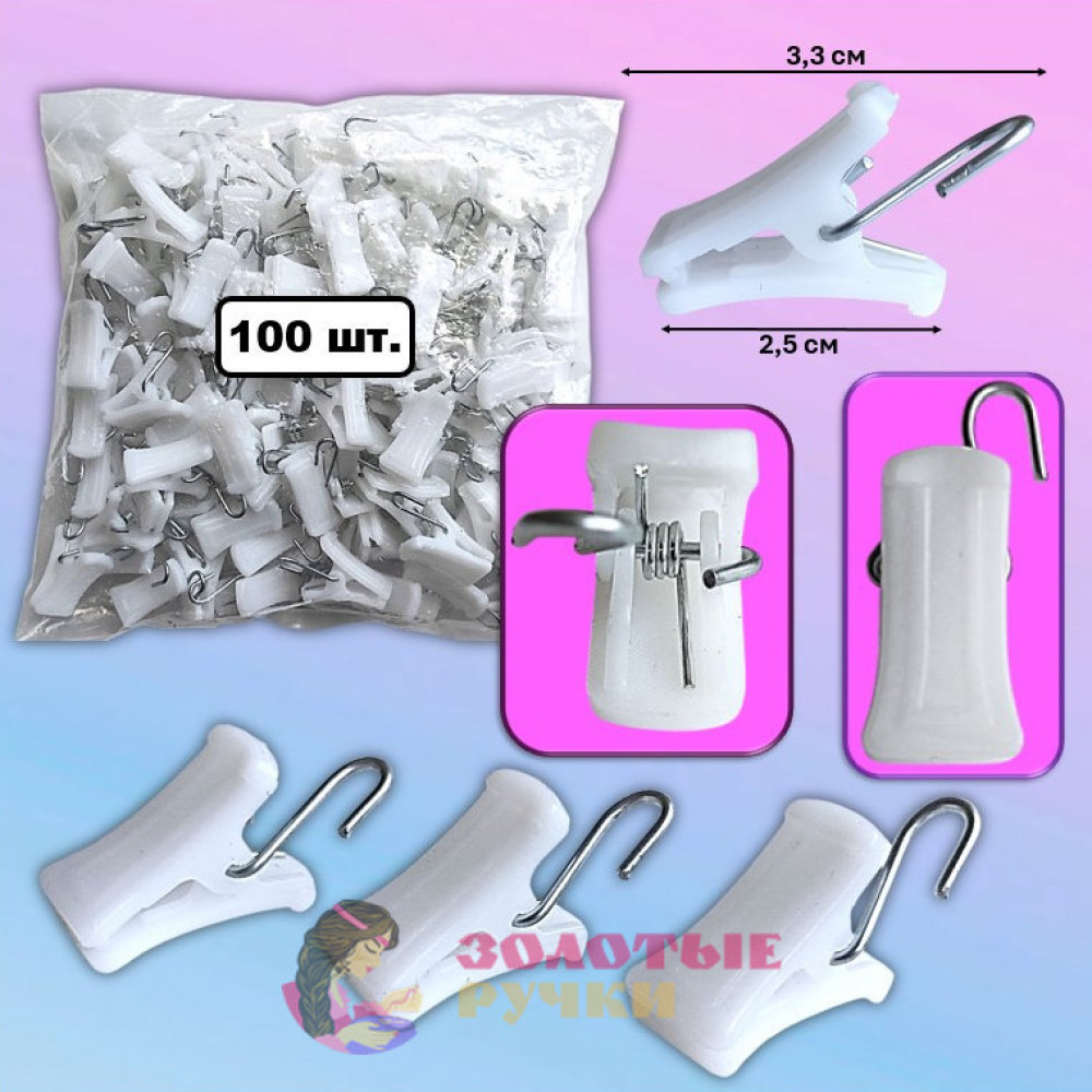 Зажимы для штор пластиковые с металлическим крючком. Цвет: белый. Количество в упаковке: 100 шт.
